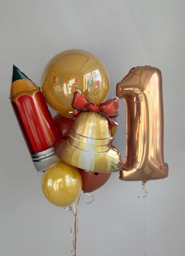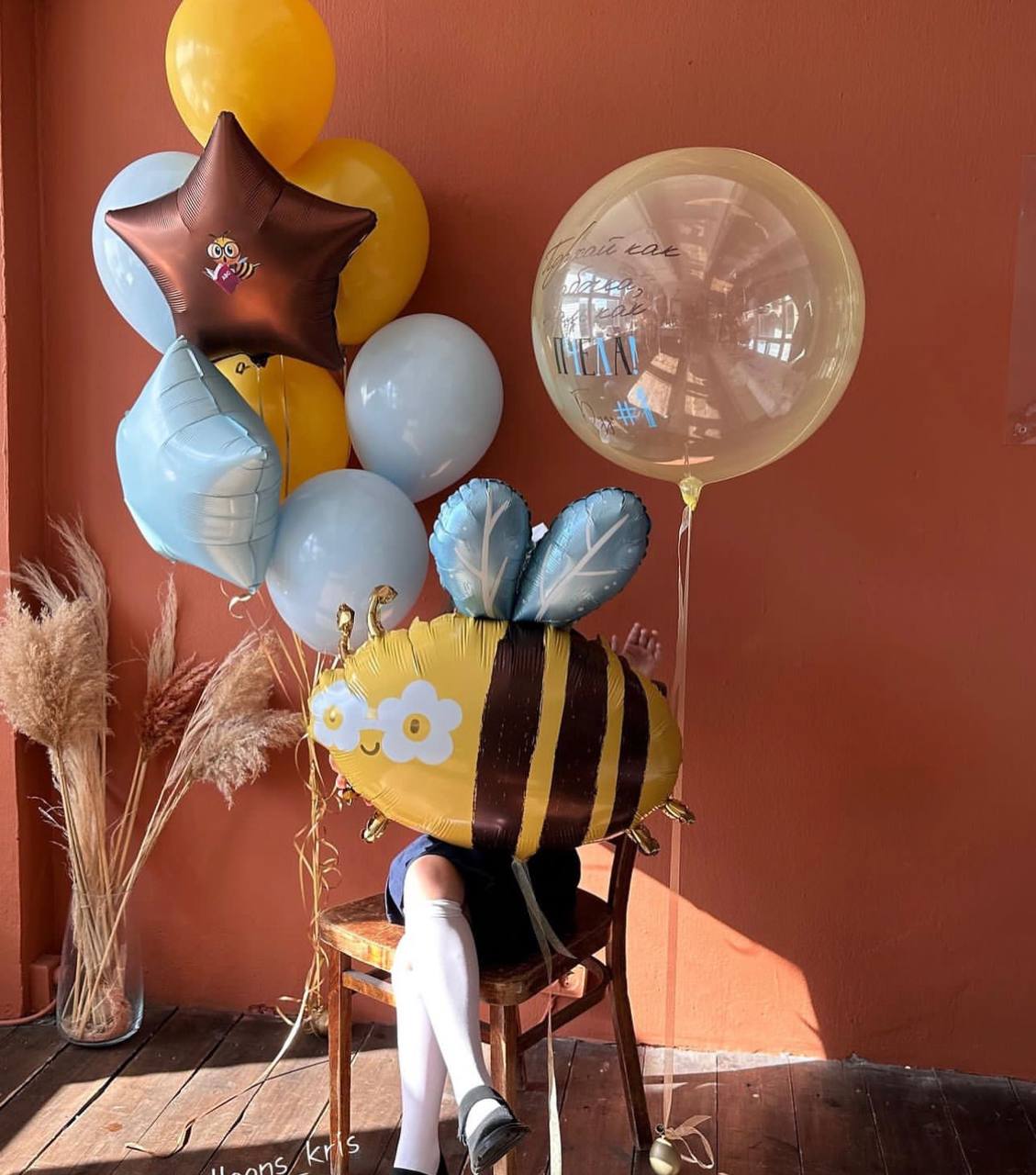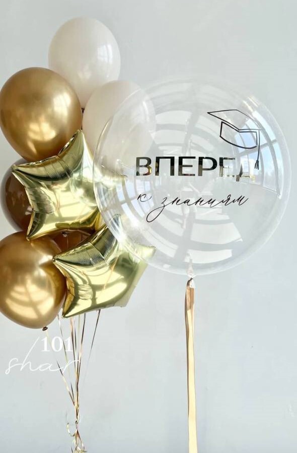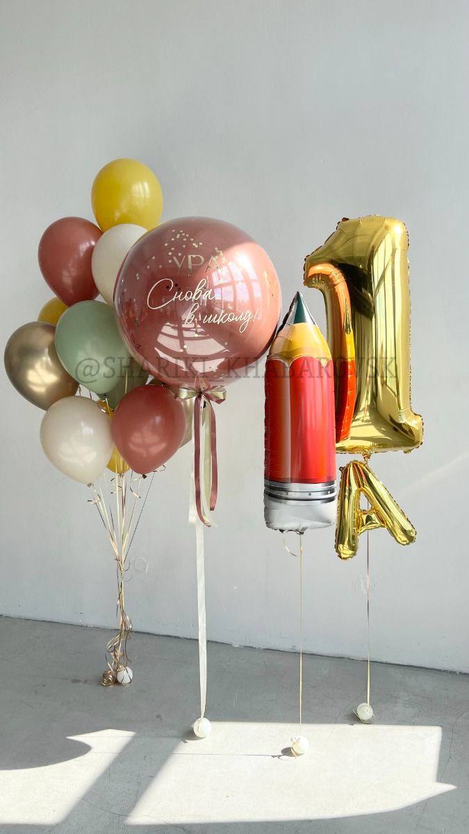 В набор входит: 1- Фонтан из 8 шаров (6 пастель, 1 звезда 45 см, 1 звезда 45 см с рисунком) + грузик 2 - Баблс 60 см + индивидуальная надпись + грузик 3 - Фигура "Пчёлка" + грузик
