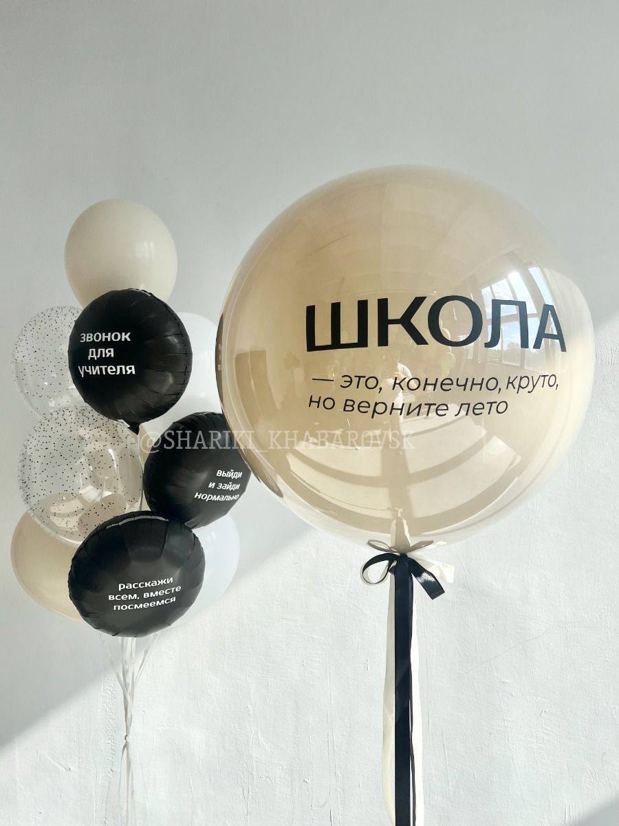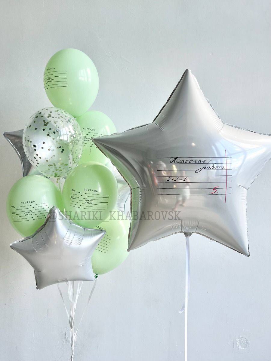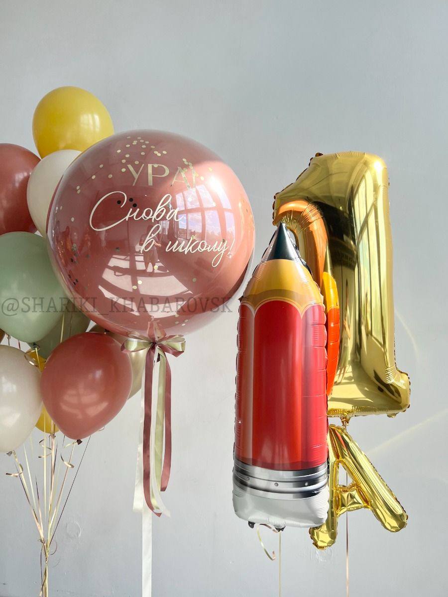 В набор входит: 1- Фонтан из 8 шаров (6 пастель, 1 звезда 45 см, 1 звезда 45 см с рисунком) + грузик 2 - Баблс 60 см + индивидуальная надпись + грузик 3 - Фигура "Пчёлка" + грузик