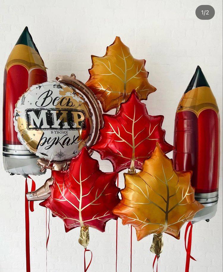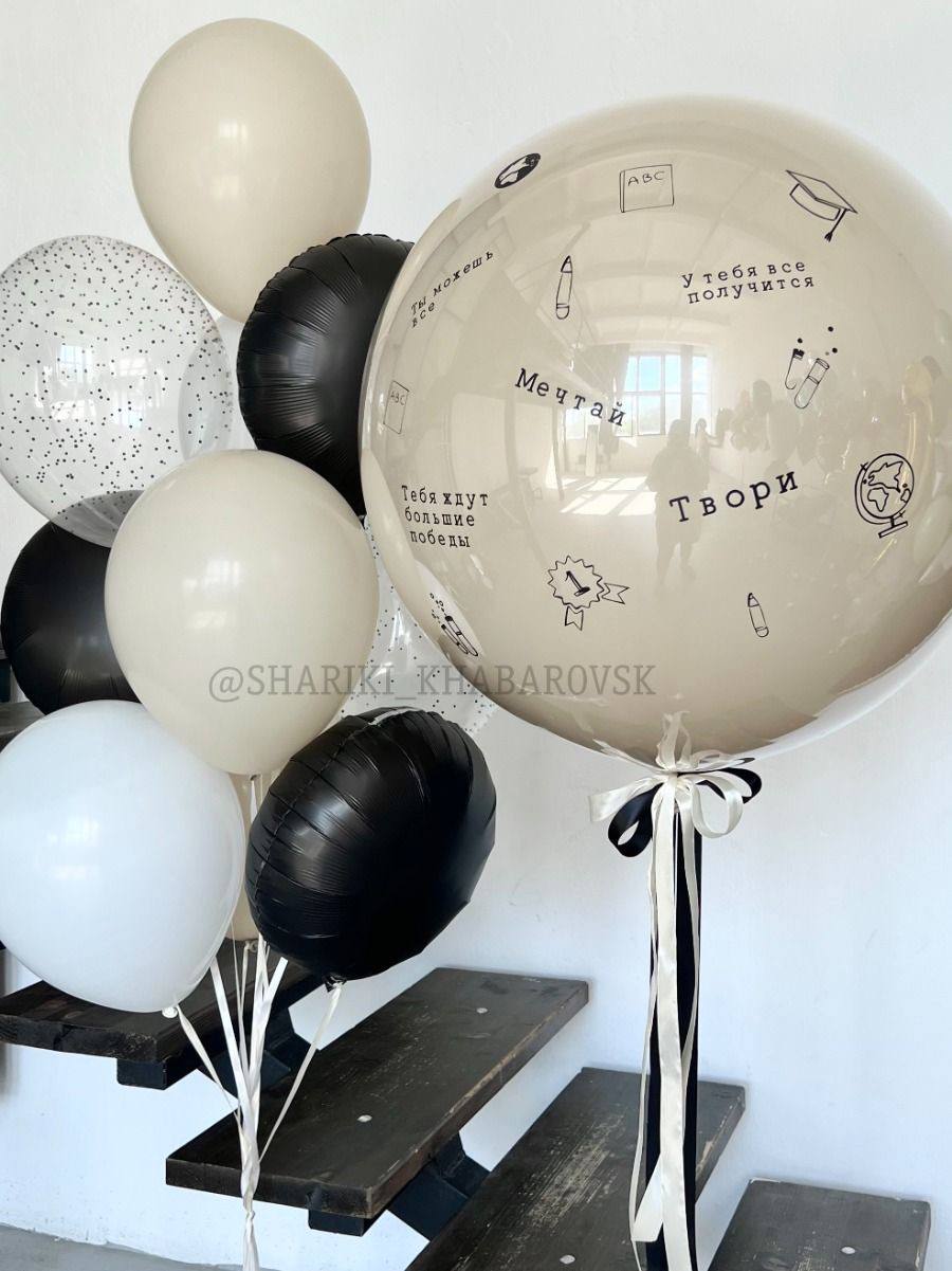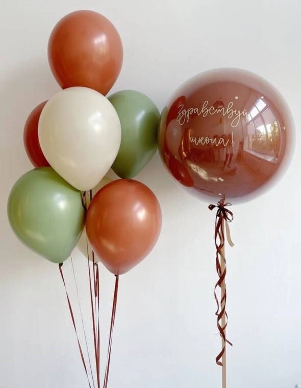 1 - Фонтан из 10 шаров (5 пастель, 2 с пенопластовыми шариками, 3 фольгированных круга 45 см с индивидуальными надписями) + грузик 2 - Стеклянный шар 60 см + прослойка из конфетти + индивидуальная надпись + грузик