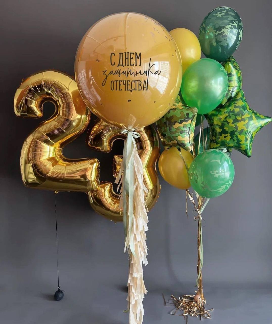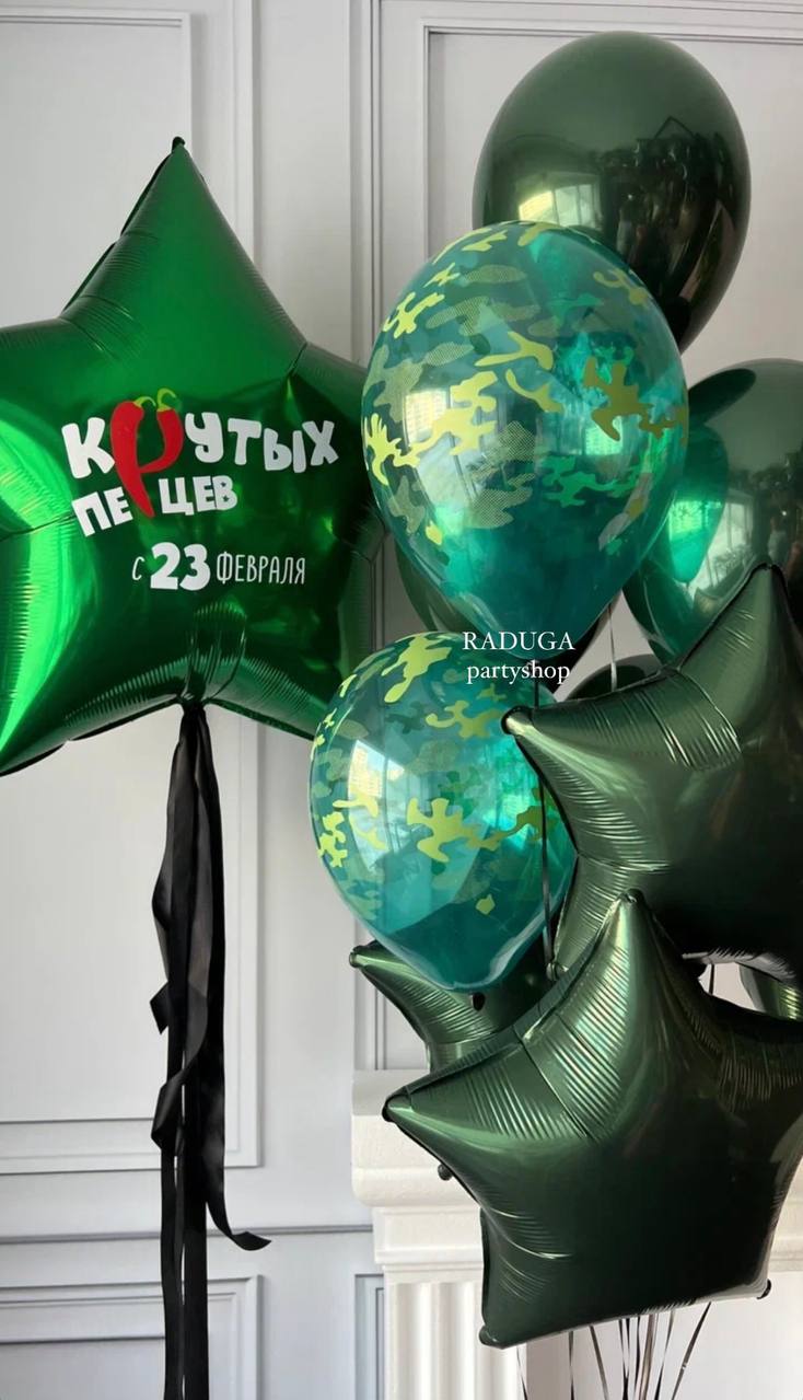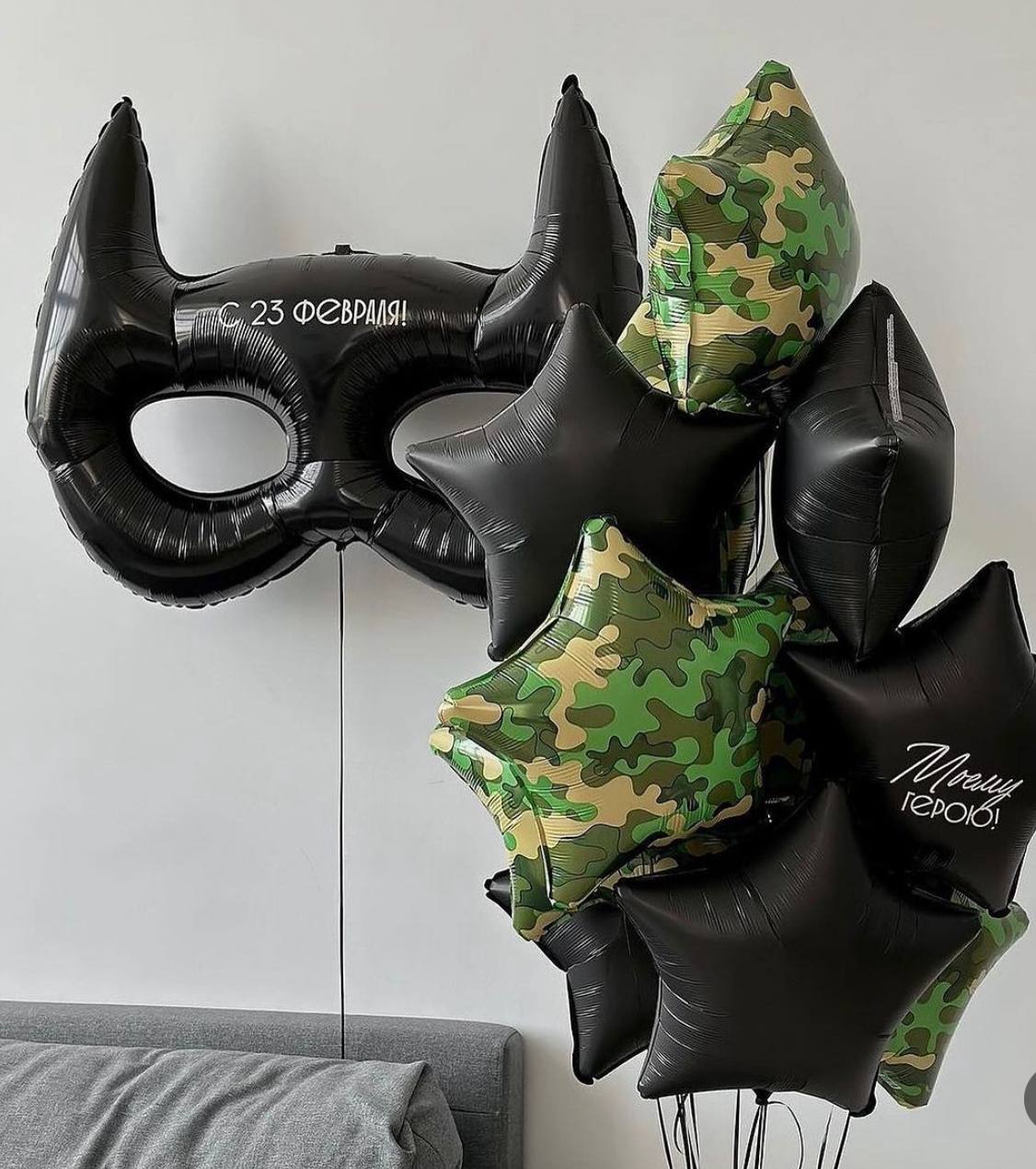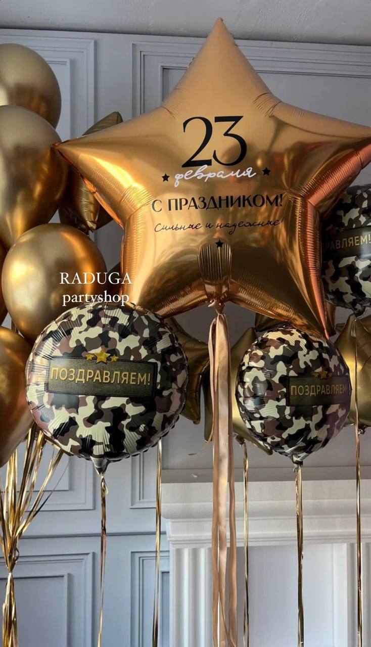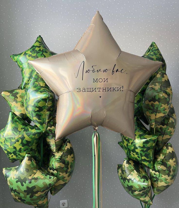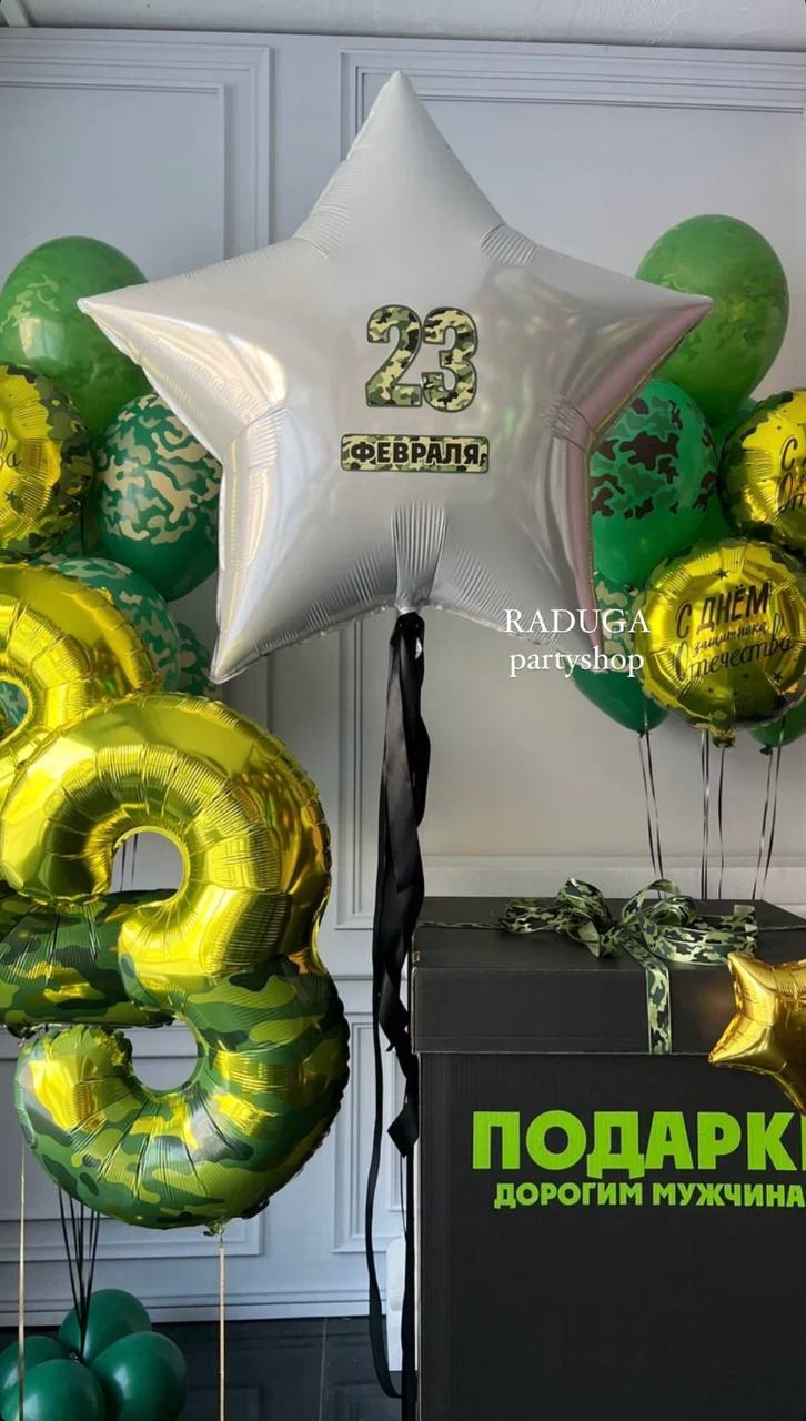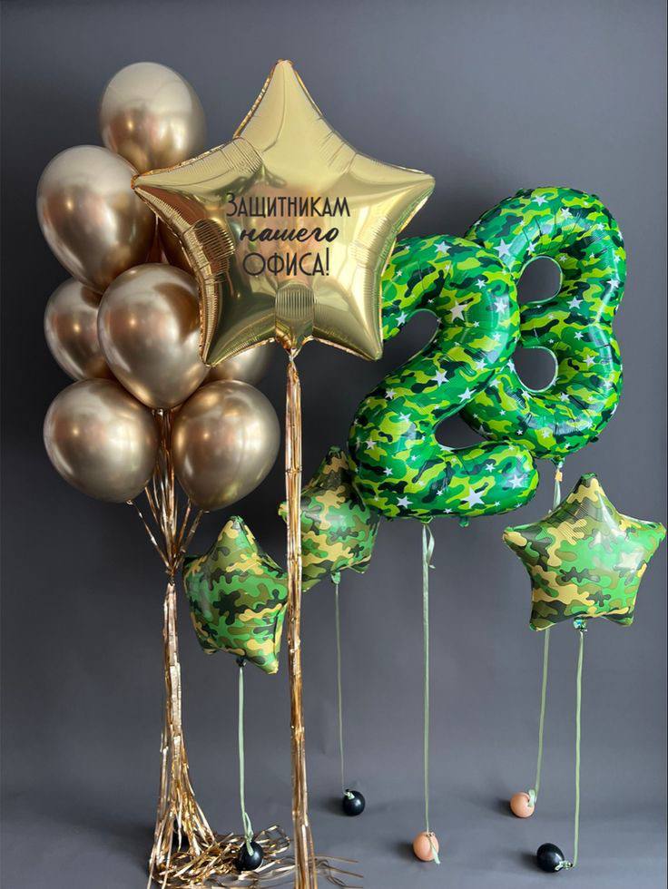 1 - Фонтан из 10 шаров хром на дождике + грузик 2 - Звезда 80 см + индивидуальная надпись + грузик 3 - 2 цифры 90 см + грузики 4 - 3 звезды 45 см камуфляж + грузики