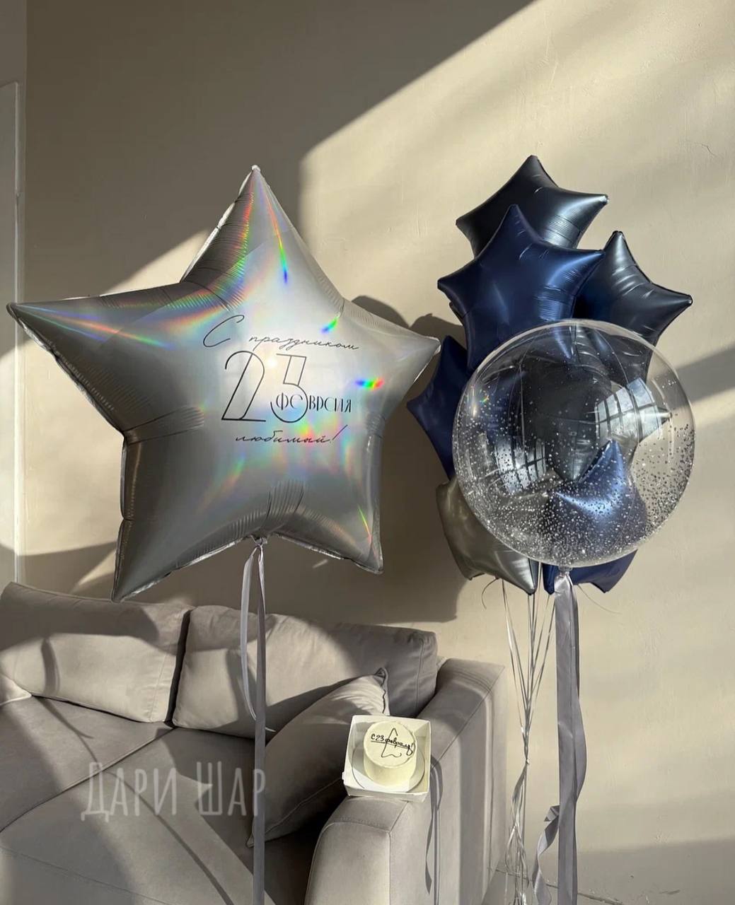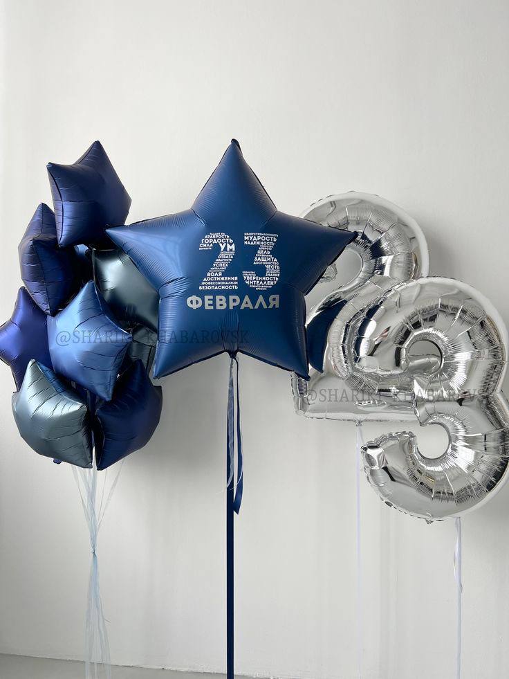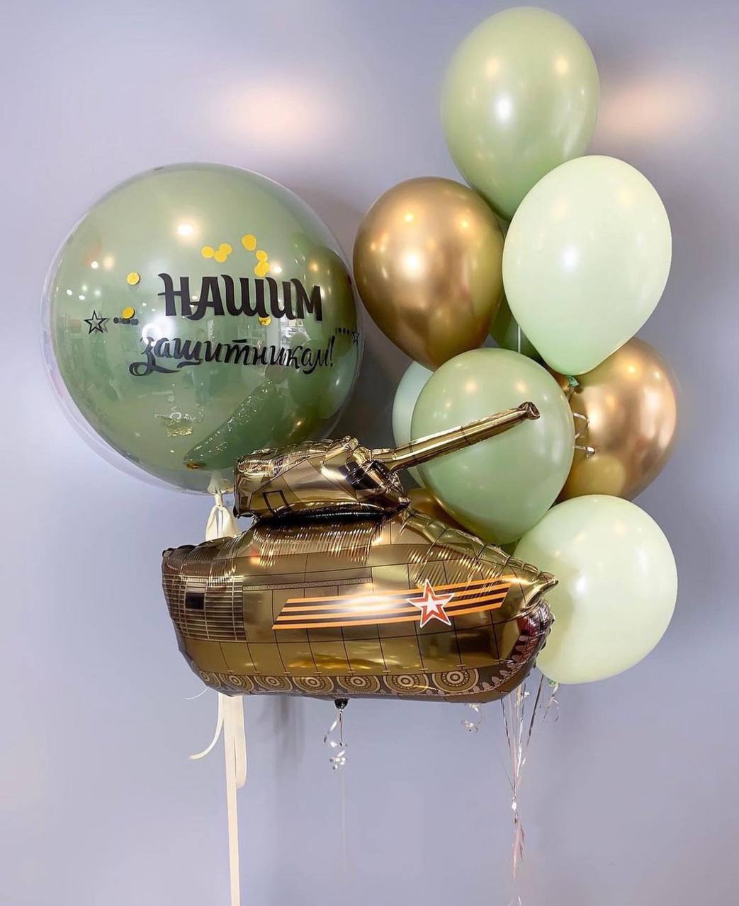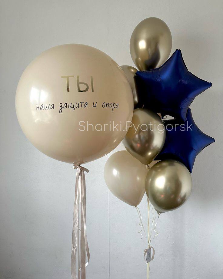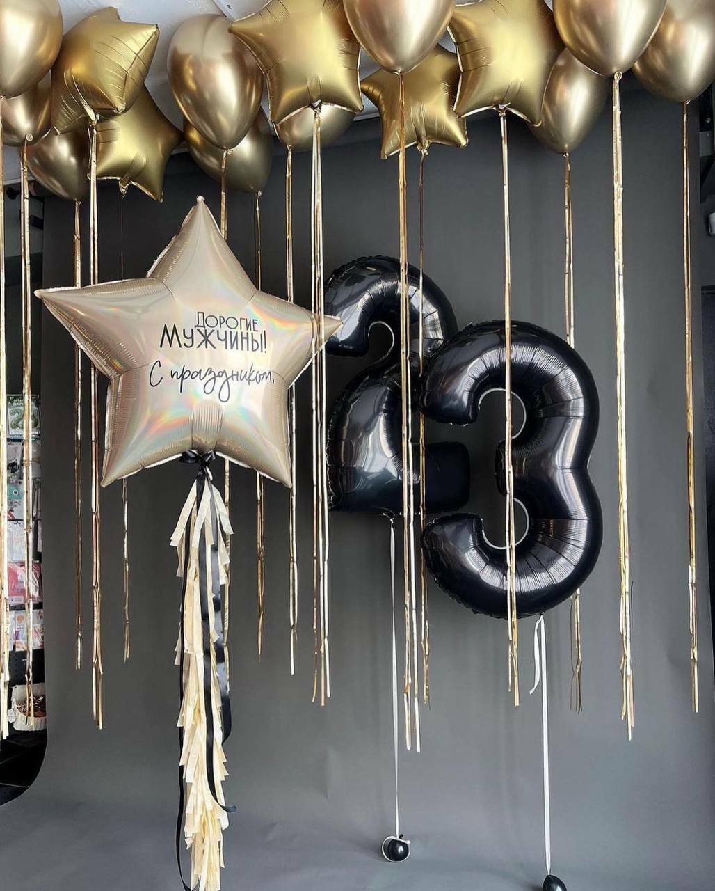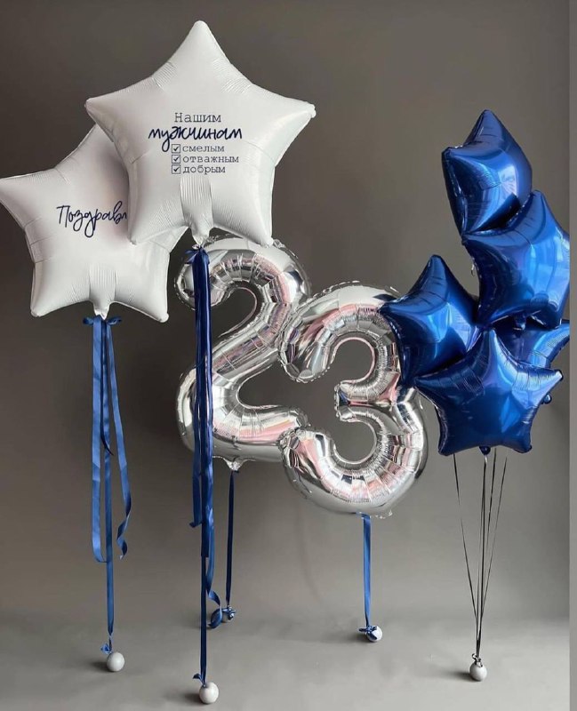1 - Фонтан из 10 шаров хром на дождике + грузик 2 - Звезда 80 см + индивидуальная надпись + грузик 3 - 2 цифры 90 см + грузики 4 - 3 звезды 45 см камуфляж + грузики