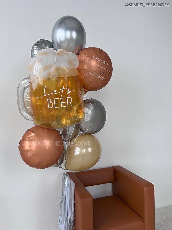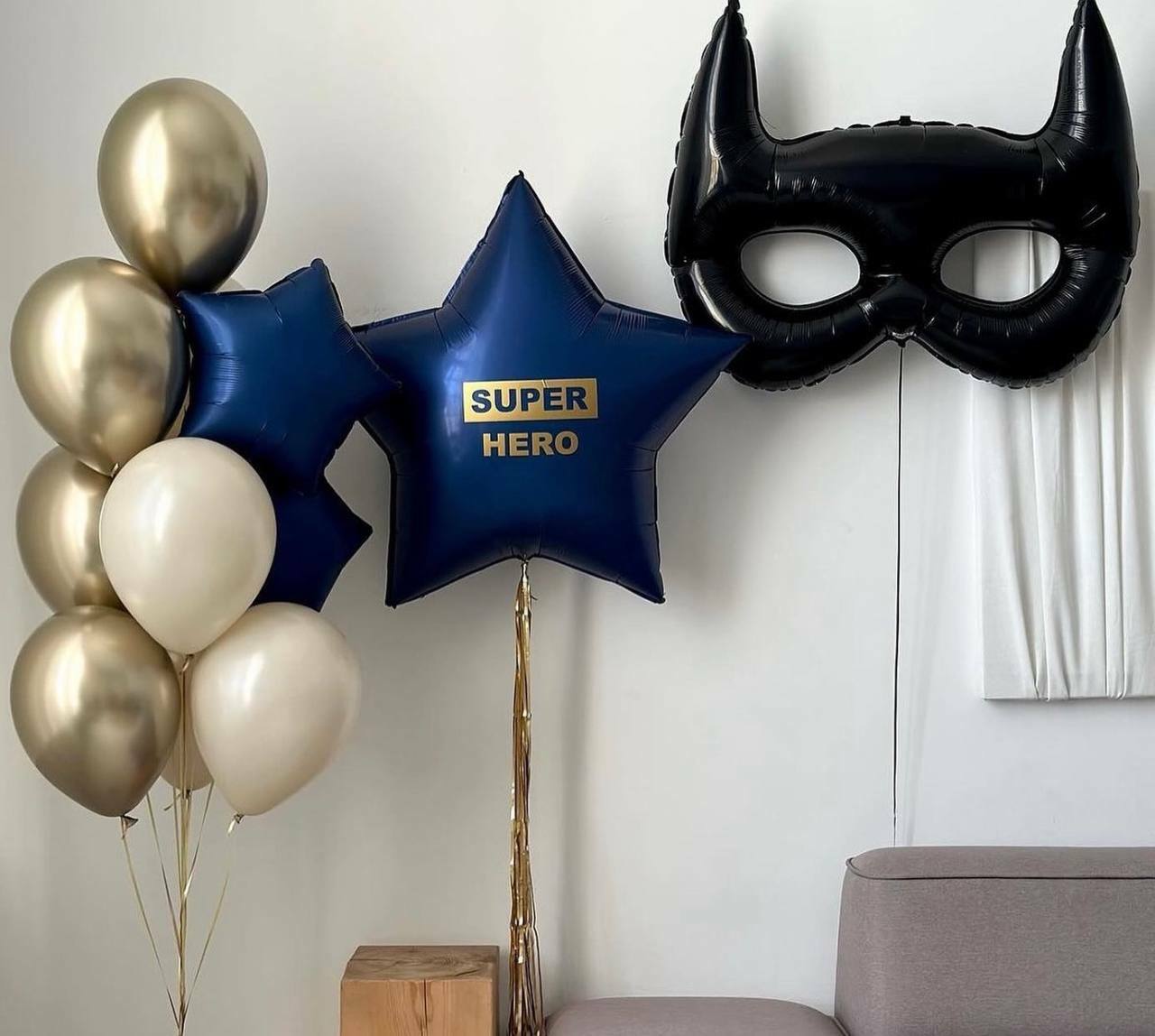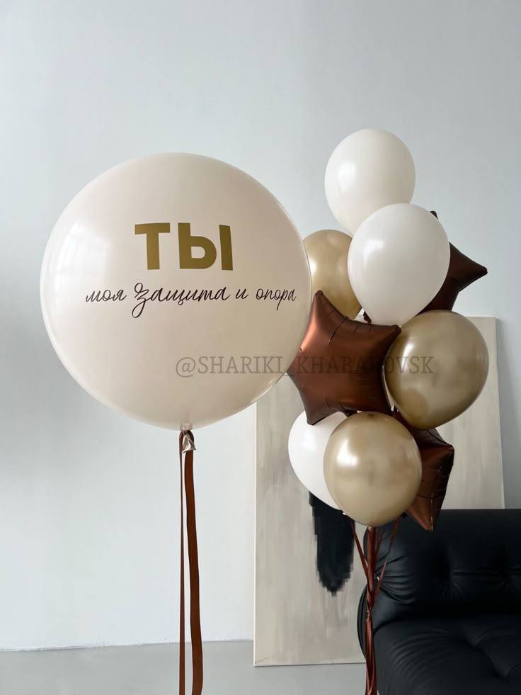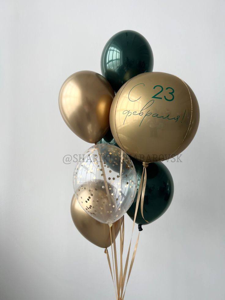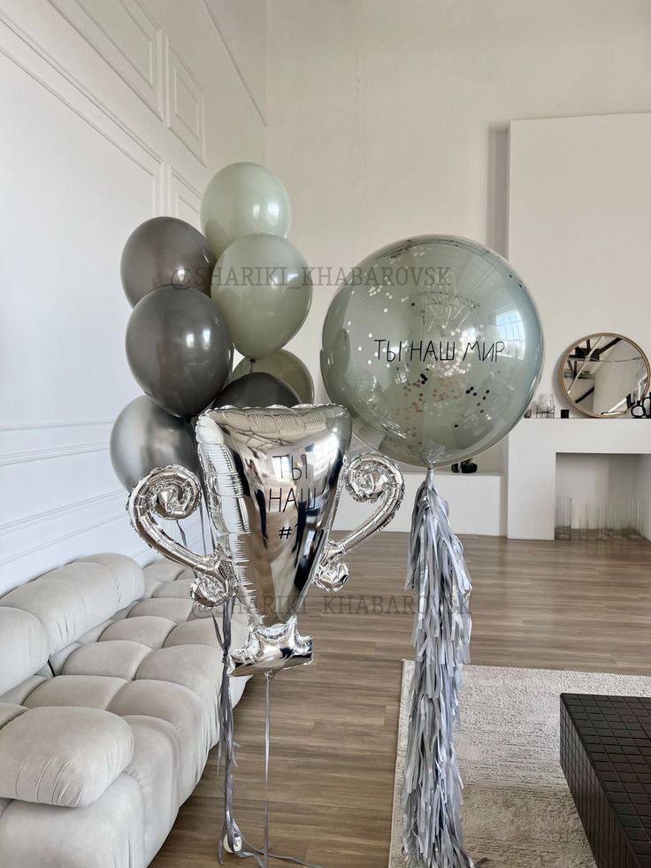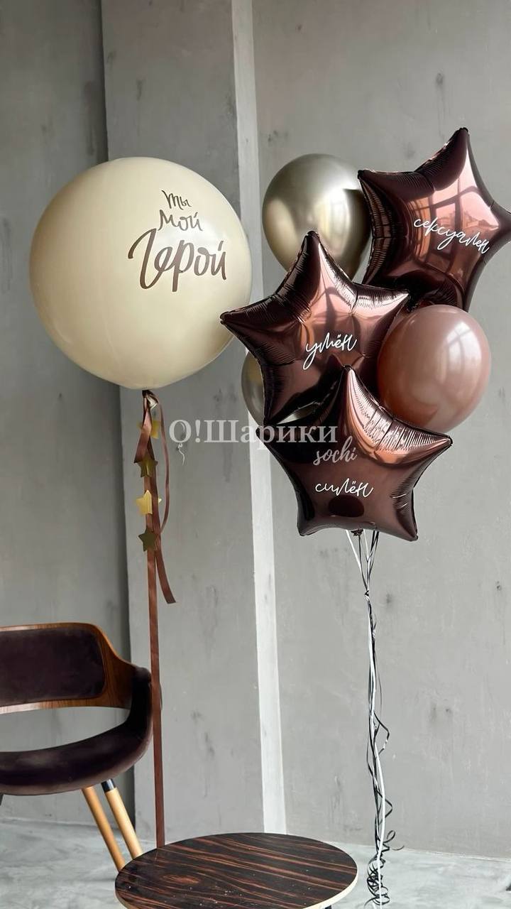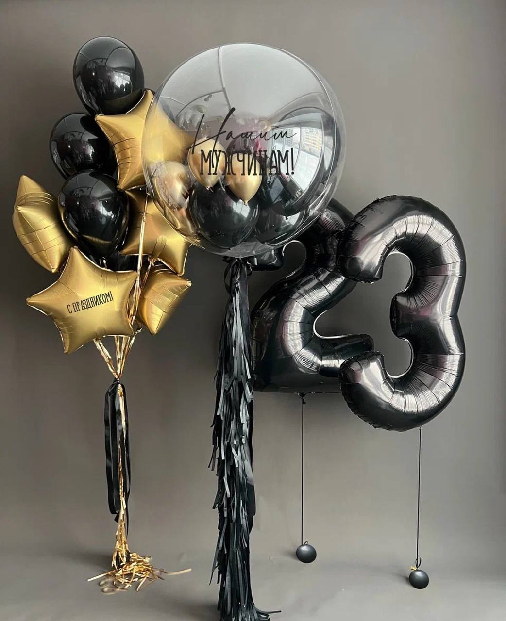 1 - Фонтан из 10 шаров хром на дождике + грузик 2 - Звезда 80 см + индивидуальная надпись + грузик 3 - 2 цифры 90 см + грузики 4 - 3 звезды 45 см камуфляж + грузики