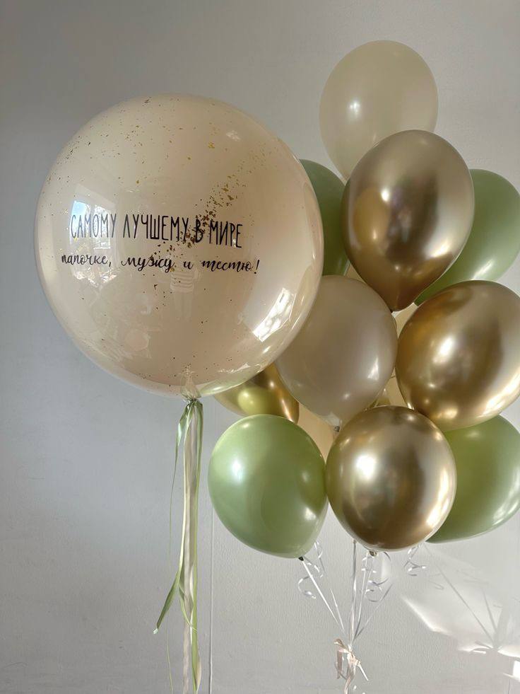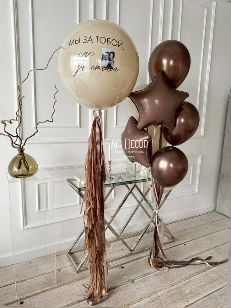 1 - Фонтан из 10 шаров на дождике (5 пастель, 4 звезды 45 см, 1 звезда 45 см с индивидуальной надписью) + грузик 2 - 2 цифры 100 см + грузики 3 - Баблс 80 см + наполнение на выбор (шарики/конфетти/перья/пенопласт) + индивидуальная надпись + лента тассел + грузик