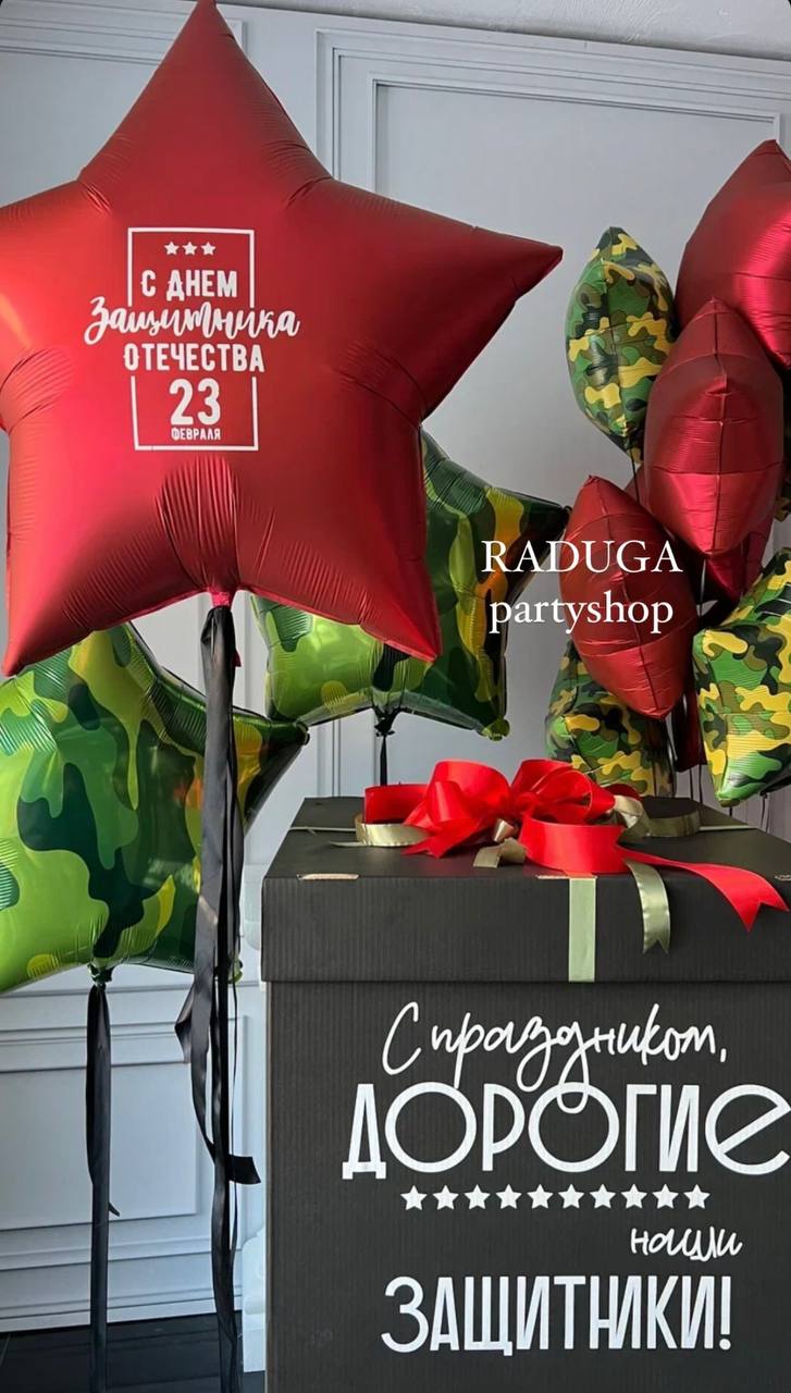 1 - Коробка-сюрприз 70 на 70 + индивидуальная надпись + бант 2 - 2 фонтана по 7 шаров (5 камуфляж, 2 круга 45 см с индивидуальной надписью) + грузик 2 - 2 цифры 80 см + грузики 3 - Звезда 90 см + индивидуальная надпись + грузик