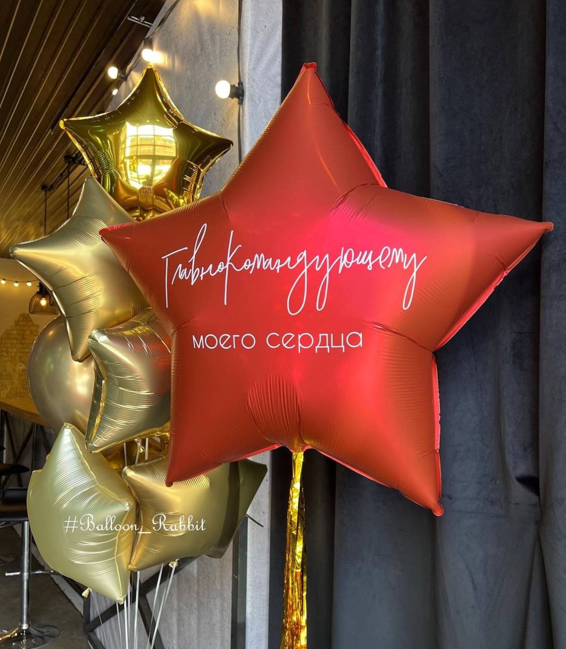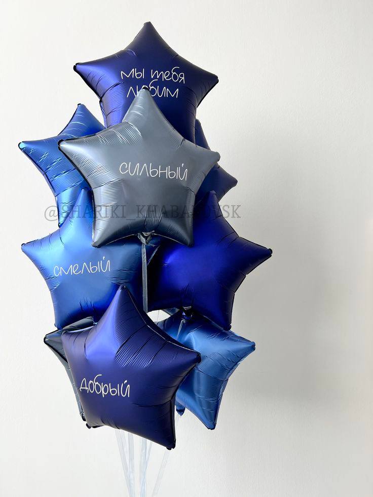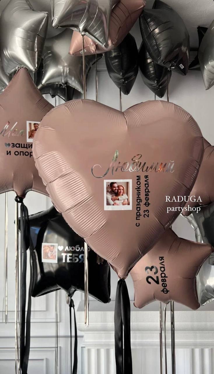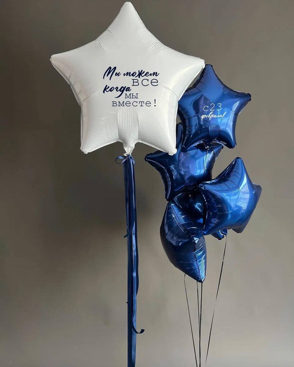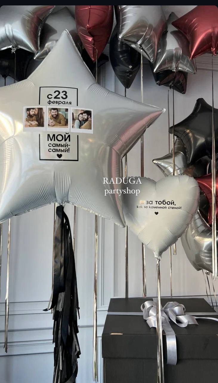 1 - Фонтан из 7 фольгированных звёзд 45 см + грузик 2 - Сердце 80 см + индивидуальная надпись + фото + грузик 3 - 2 звезды 80 см + индивидуальная надпись + фото + грузик 4 - Звезда 45 см + индивидуальная надпись + грузик 4 - 12 фольгированных звёзд 45 см под потолок