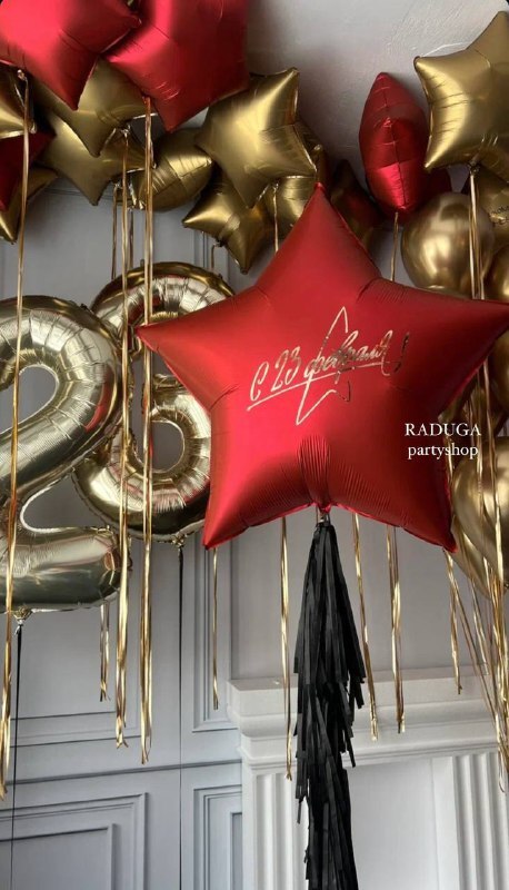 1 - Фонтан из 10 шаров хром + грузик 2 - Звезда 90 см + индивидуальная надпись + тассел + грузик 3 - 2 цифры 90 см + грузики 4 - 15 звёзд 45 см под потолок на дождике
