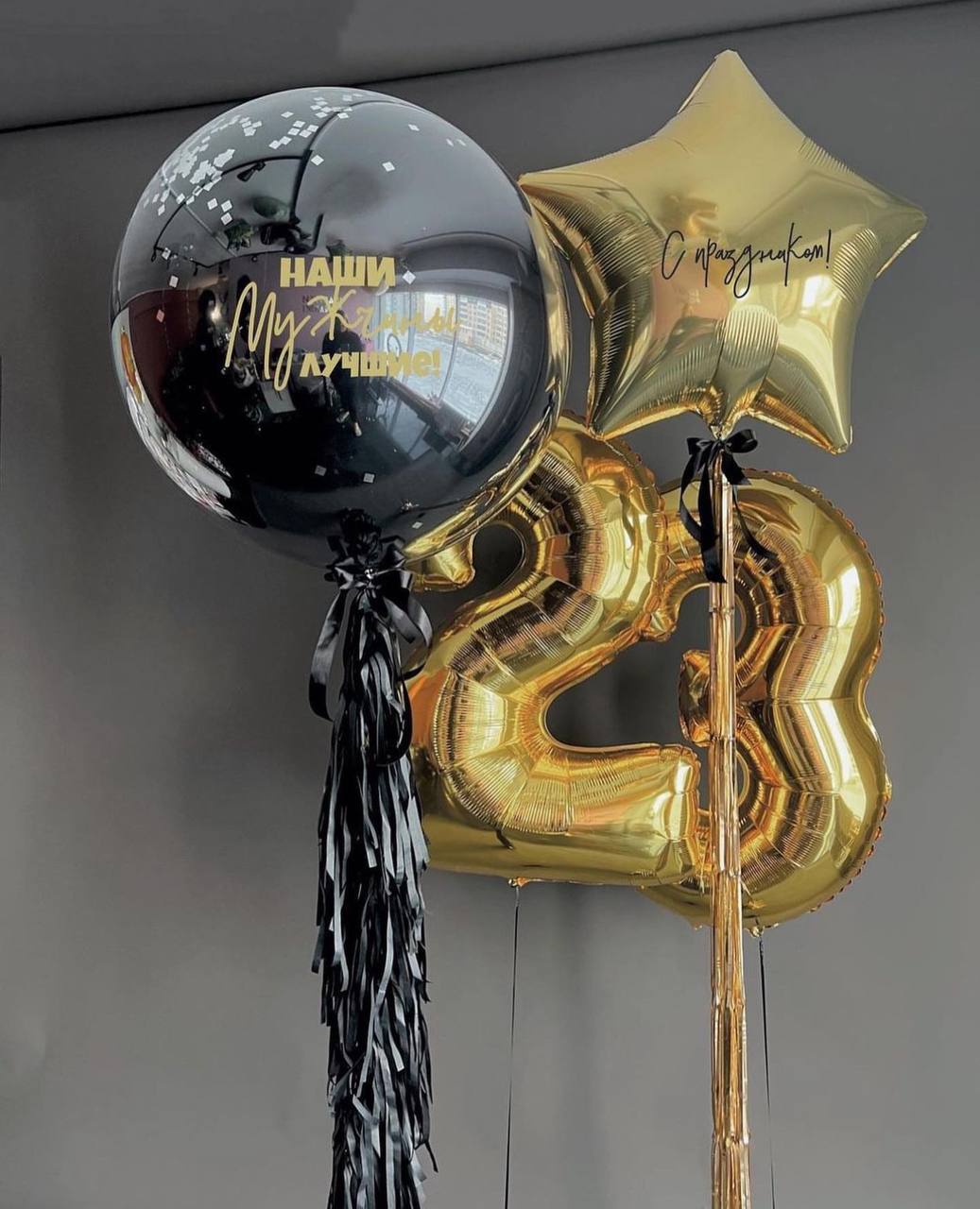 1 - Стеклянный шар 60 см + прослойка из конфетти + индивидуальная надпись + тассел + грузик 2 - 2 цифры 100 см + грузики 3 - Звезда 75 см + индивидуальная надпись + грузик