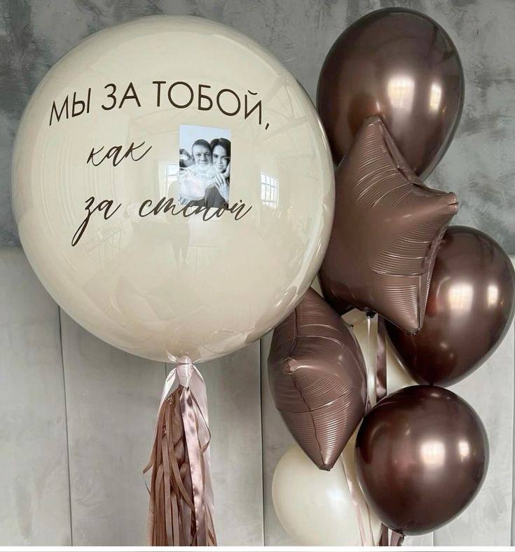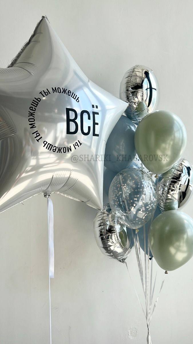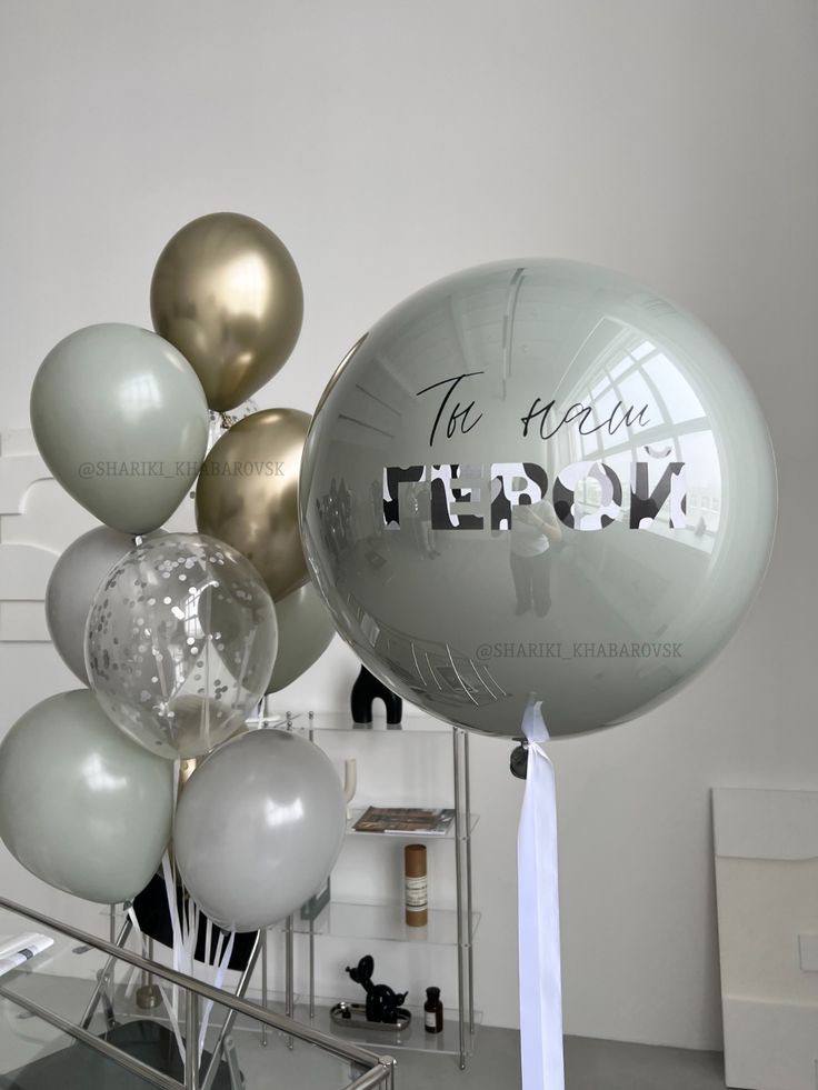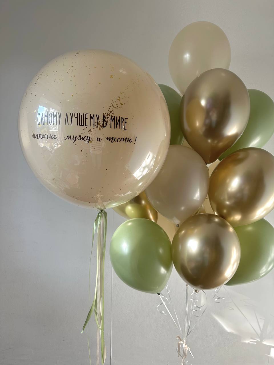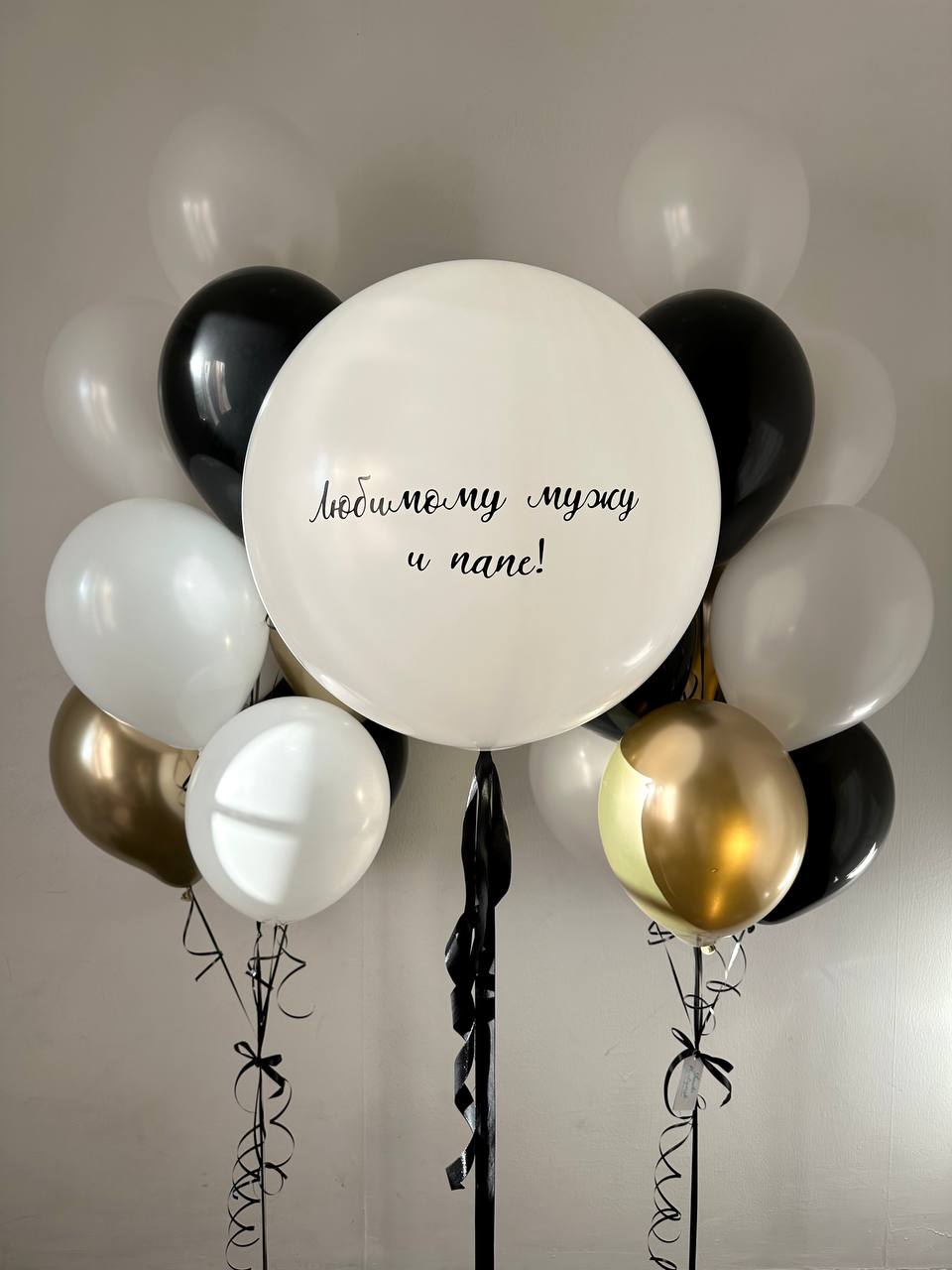 1 - Фонтан из 10 шаров (7 пастель, 3 хром) + грузик 2 - Стеклянный шар 60 см + прослойка из конфетти + индивидуальная надпись + тассел + грузик 3- кубок с надписью + грузик
