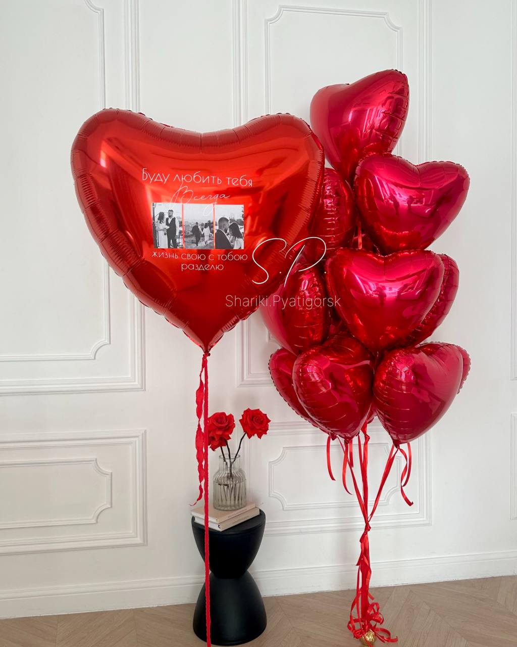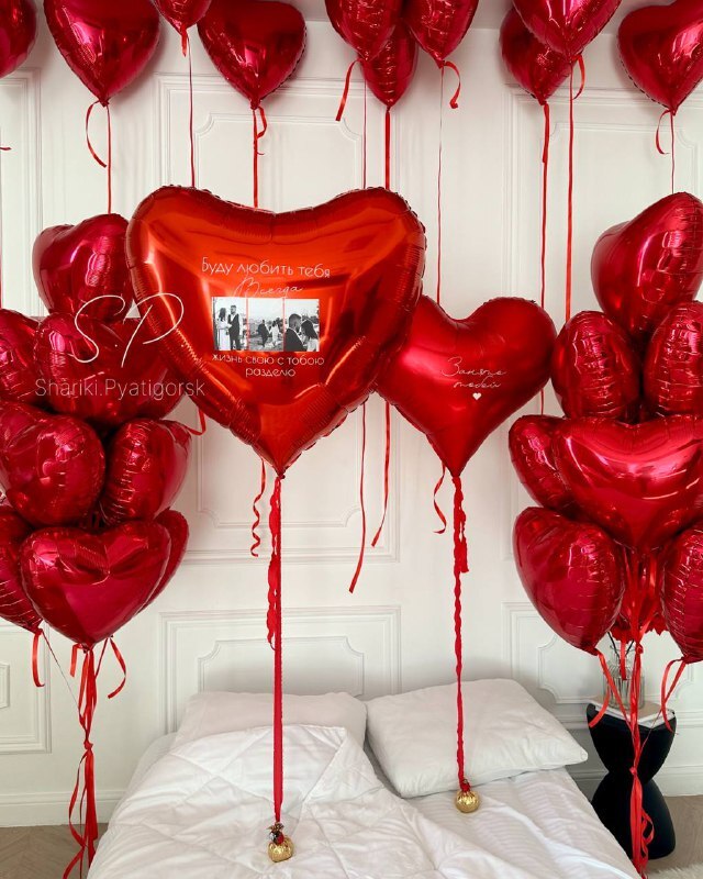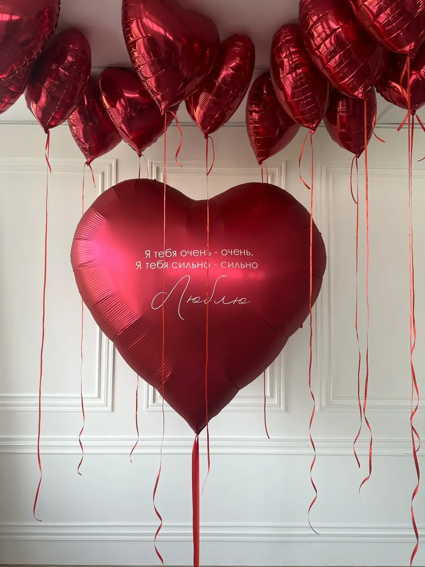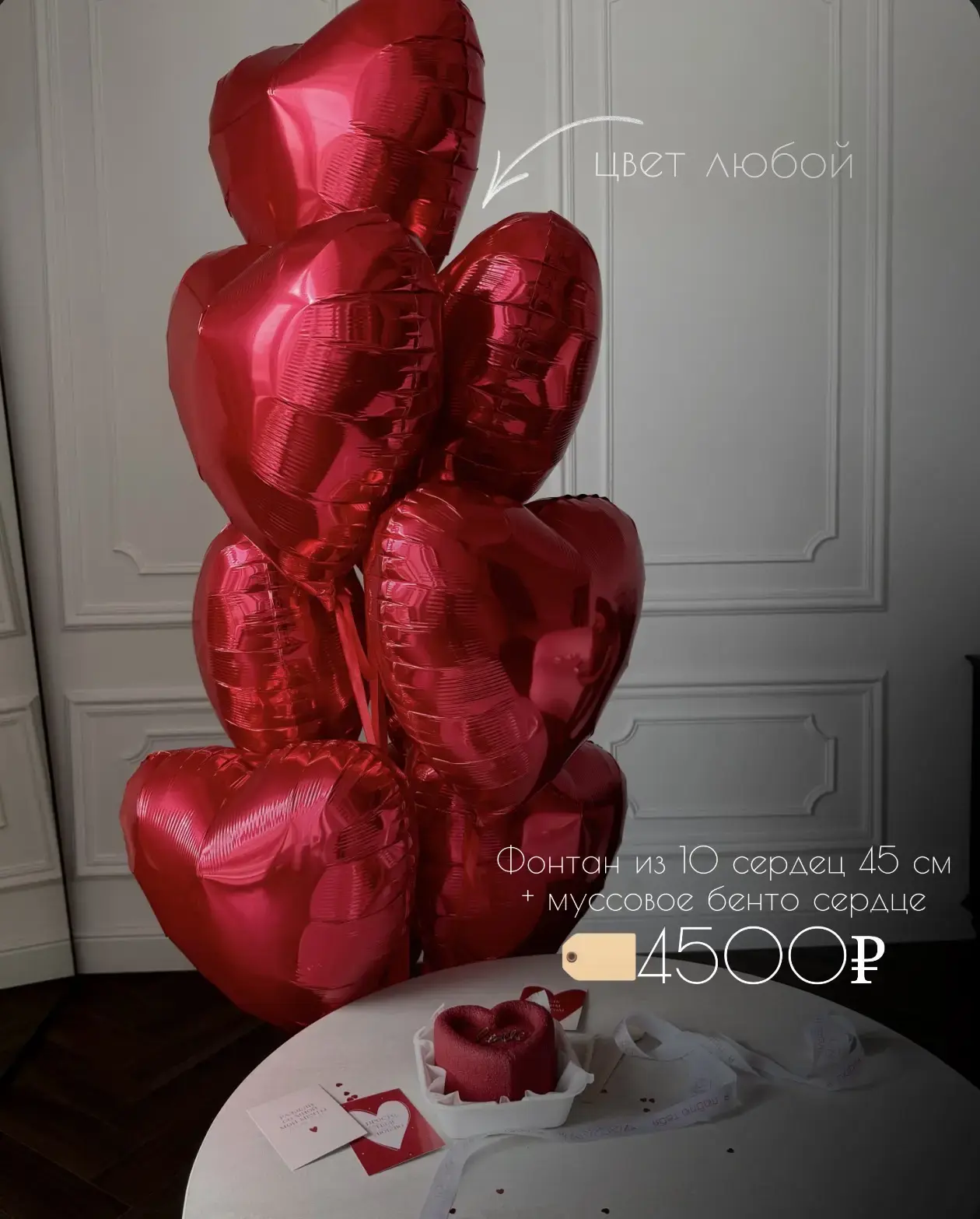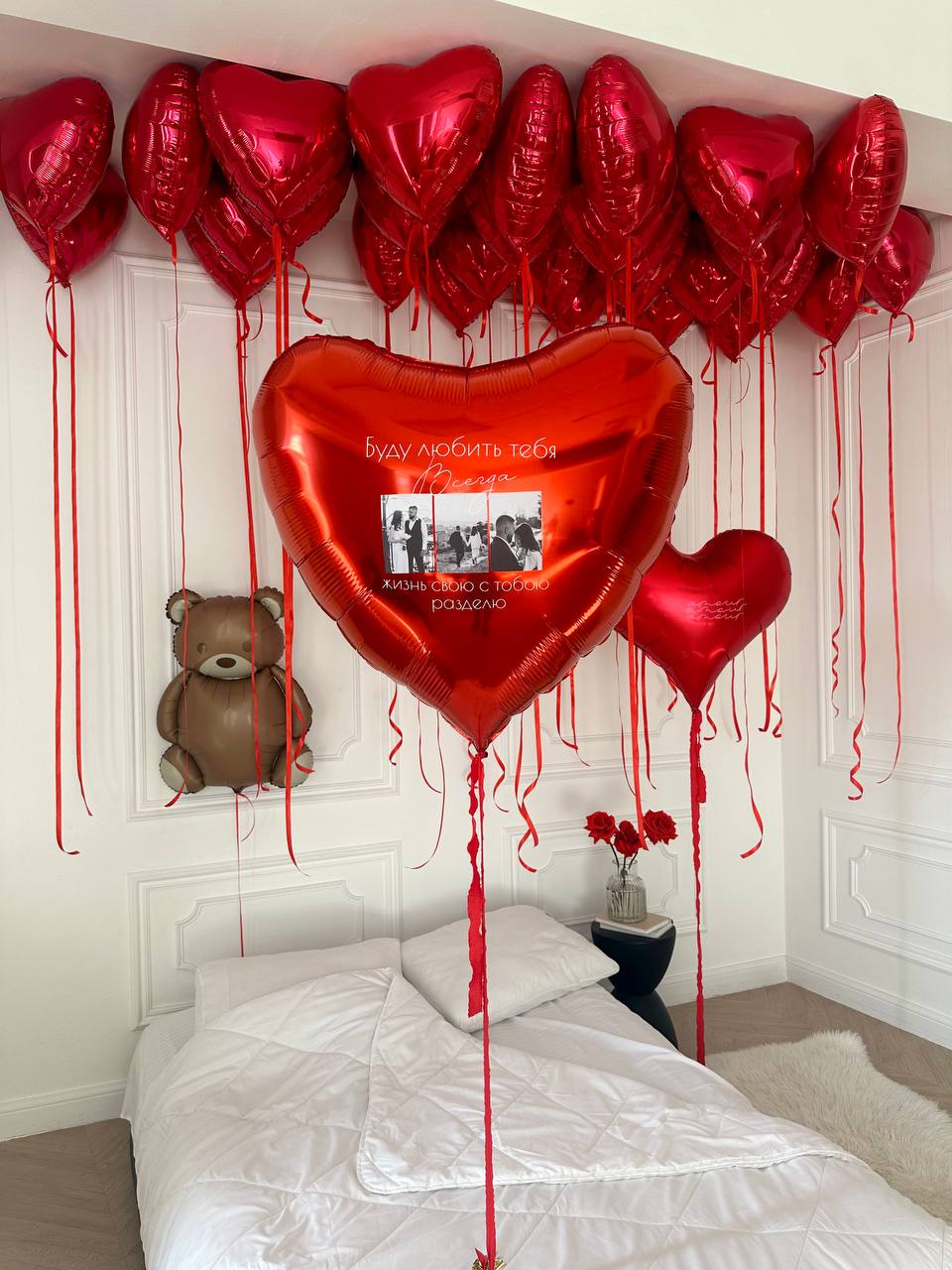 1- 2 фонтана по 10 сердец 45 см + грузики 2 - Сердце 50 см + индивидуальная надпись + грузик 3 - Сердце 90 см + индивидуальная надпись + фото + грузик 4 - 10 сердец 45 см под потолок