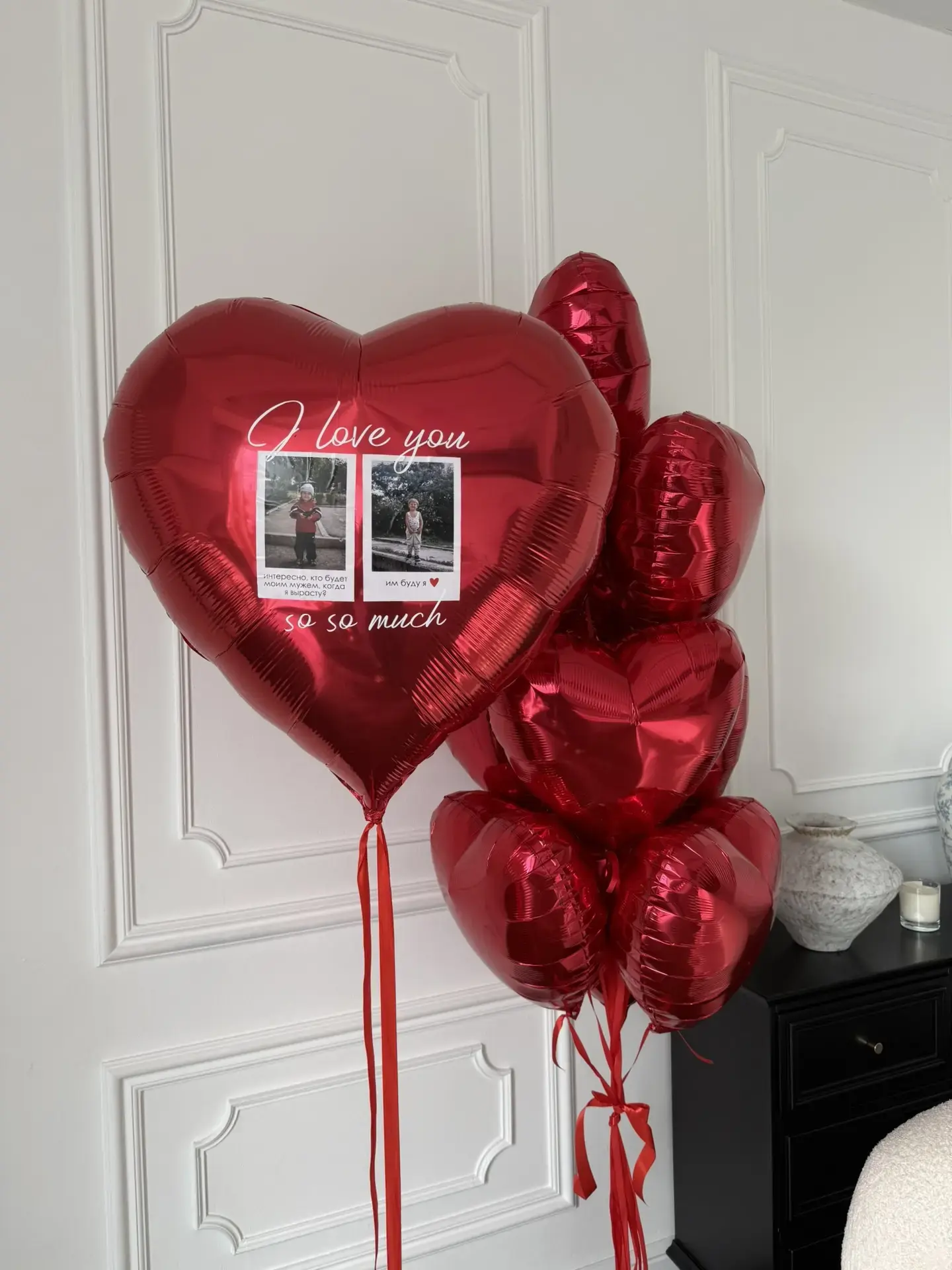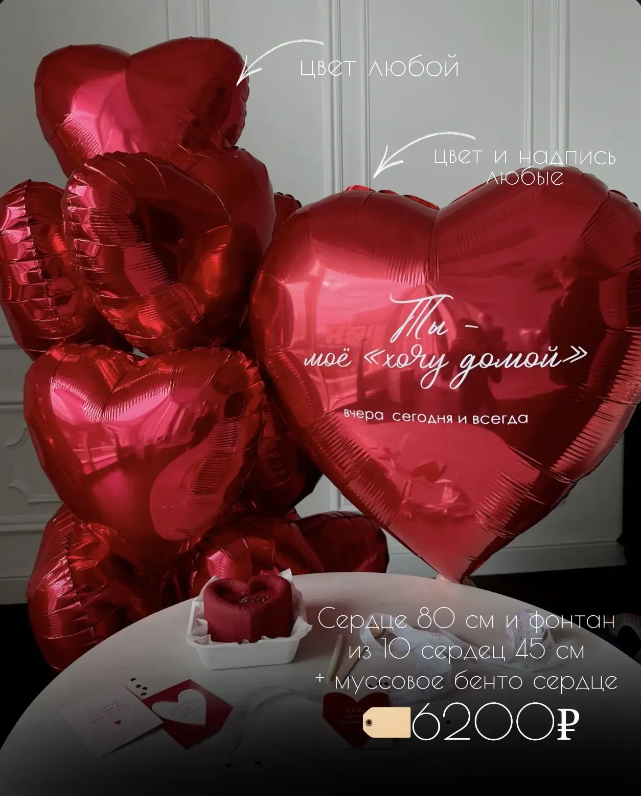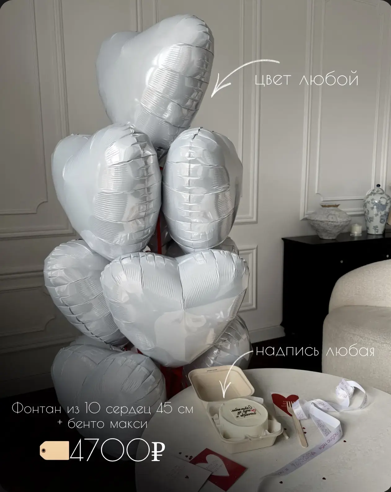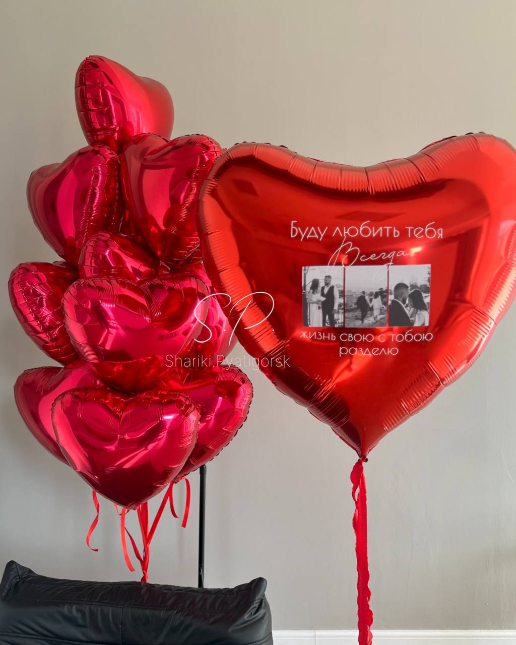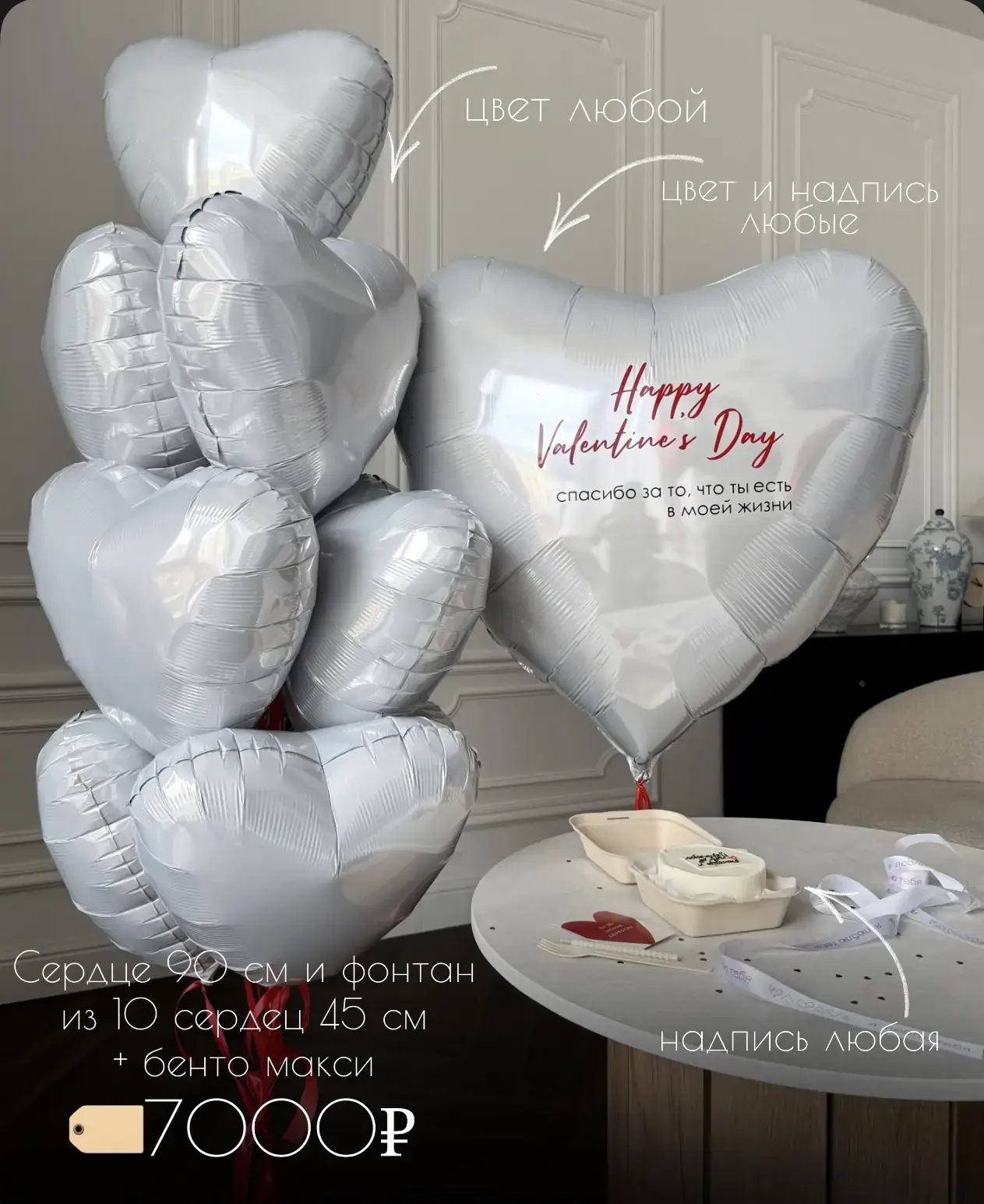1- 2 фонтана по 10 сердец 45 см + грузики 2 - Сердце 50 см + индивидуальная надпись + грузик 3 - Сердце 90 см + индивидуальная надпись + фото + грузик 4 - 10 сердец 45 см под потолок