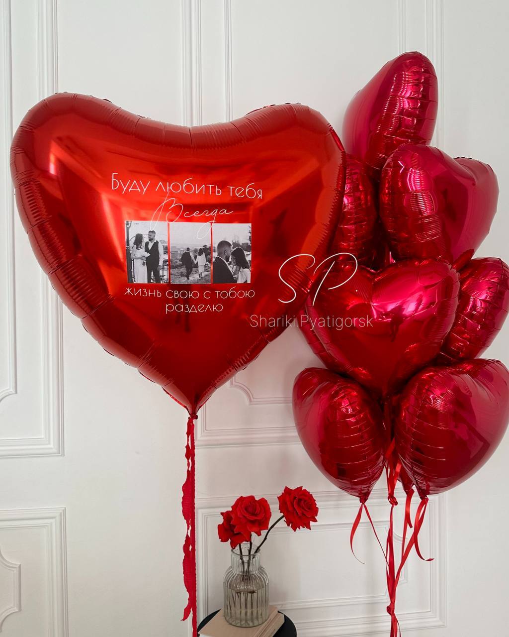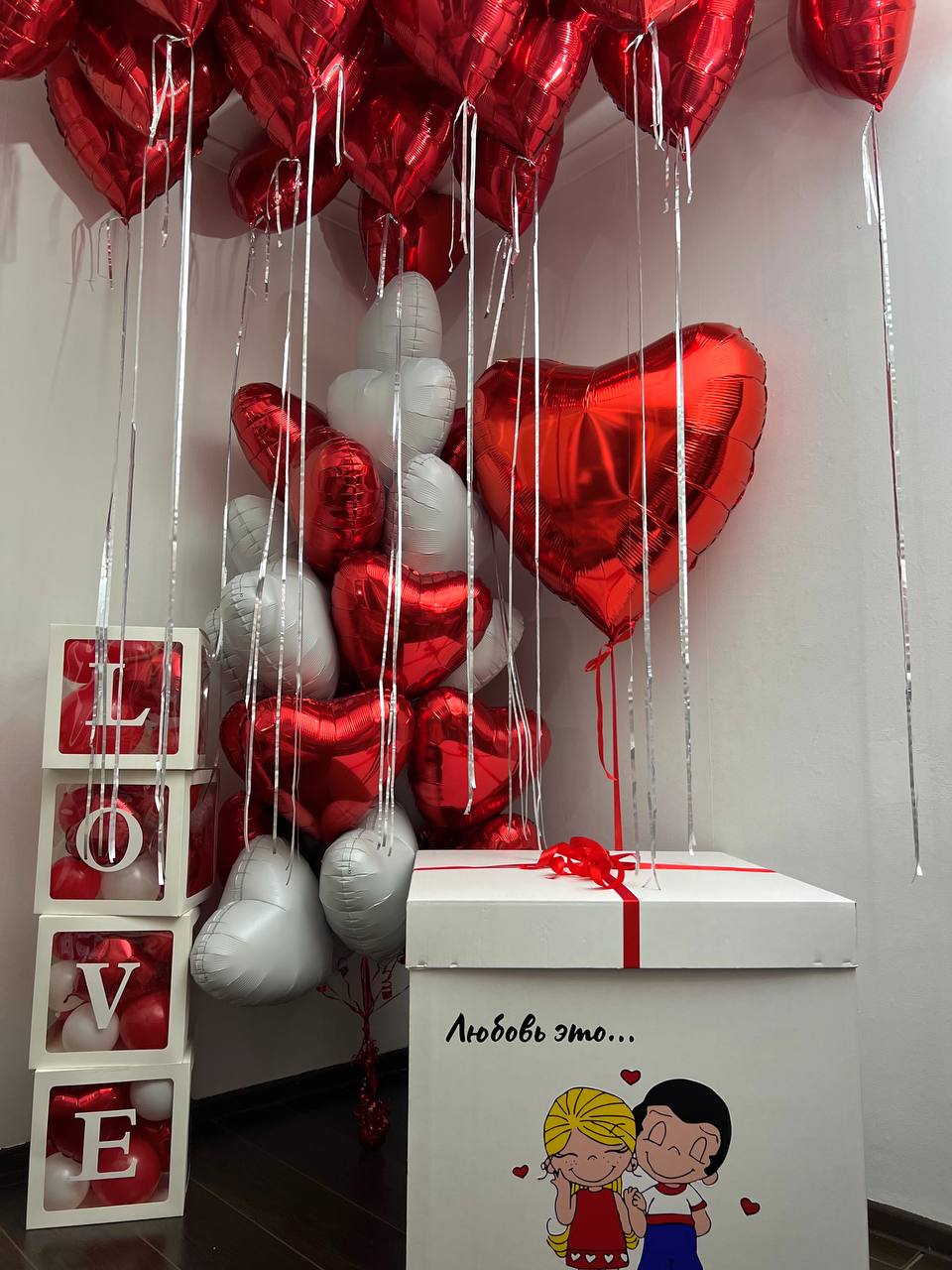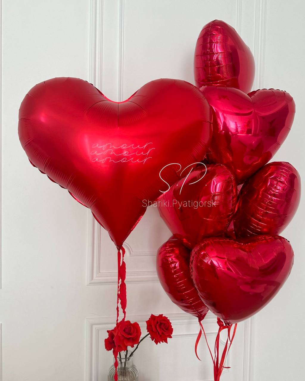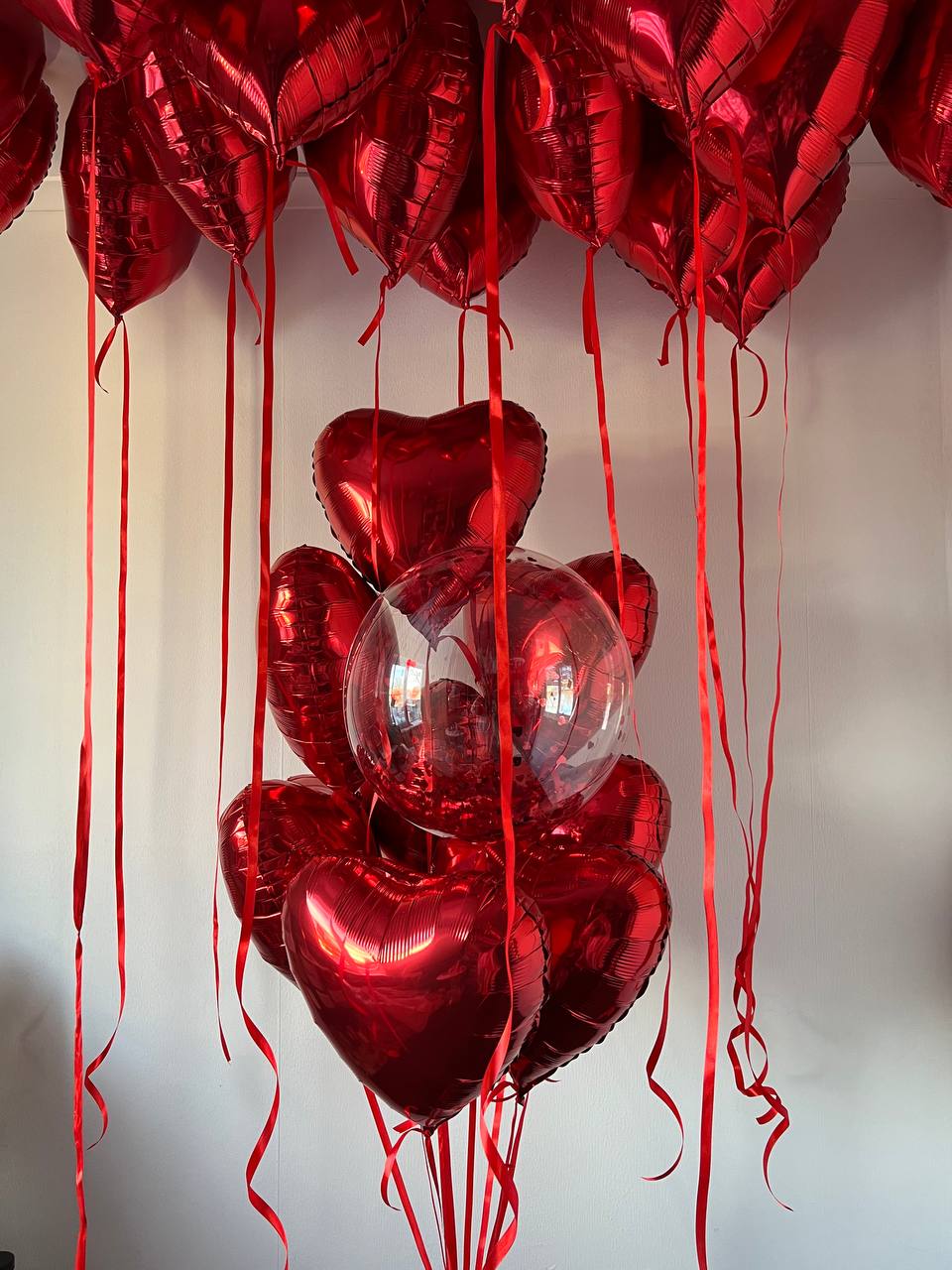 1- 2 фонтана по 10 сердец 45 см + грузики 2 - Сердце 50 см + индивидуальная надпись + грузик 3 - Сердце 90 см + индивидуальная надпись + фото + грузик 4 - 10 сердец 45 см под потолок